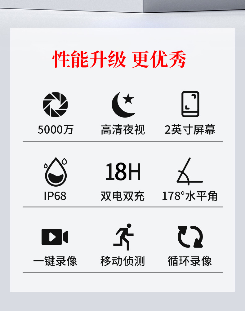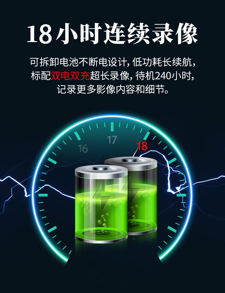 • 產(chǎn)品描述:高清夜視 5000萬高清像素 雙電雙充18小時超長待機 迷你輕巧0負擔 功能強大 一鍵操作 適用于酒店管理 物業(yè)管理 公安執(zhí)法 鐵路巡檢 個人旅游等