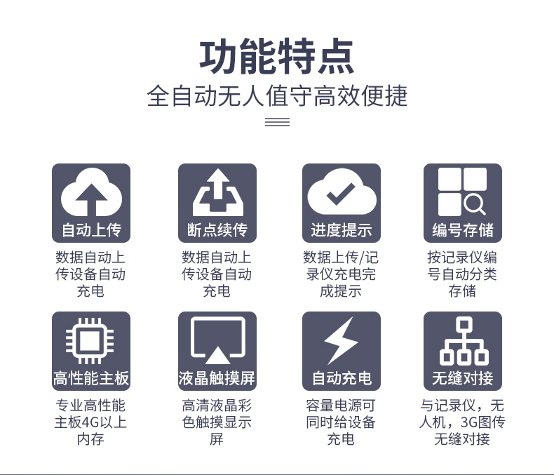 • 產(chǎn)品描述:數(shù)據(jù)自動上傳設(shè)備自動充電 按記錄儀編號自動分類存儲 適用于市場上99%的執(zhí)法記錄儀 全自動上傳避免感染木馬病毒